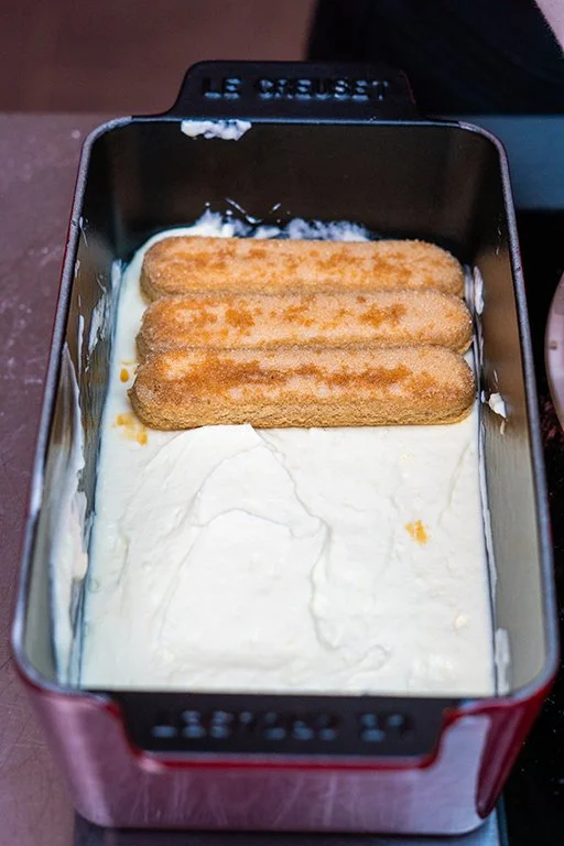 In einer rechteckigen Form die in Espresso getränkten Löffelbiskuit auslegen und mit der Creme schichten. 2-3 Mal wiederholen, je nach Format der Form. Mit einer Mascarponecreme Schicht abschließen, diese dann mit Kakaopulver bestäuben und dunkle Schokolade drüber reiben.